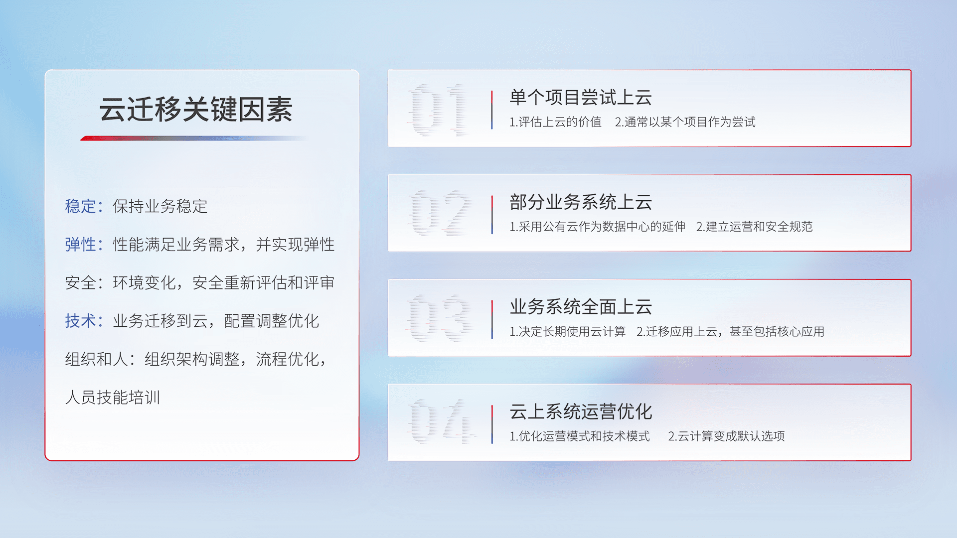 结合实际业务,,,从规划设计、、、云平台选型、、云原生改造、、、数据迁移、、、集成交付,,,,迁移全过程为客户识别最佳上云路径,,,,做好风险识别管理,,,,设计网络架构、、、身份权限、、、、安全审计合规、、、、操作审计、、、、日志审计、、、监控告警策略、、多站点容灾设计等,,对云上基础设施进行整体规划,,,,提升IT治理水平,,,,以满足弹性、、、、高可用、、、、高性能的需求。。。